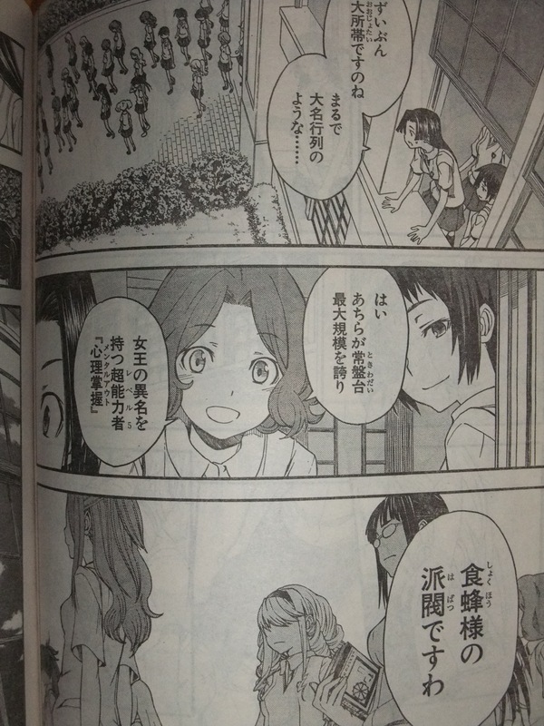 今回、超電磁砲の漫画でレベル5の第5位が登場しました。禁書の方では美琴の回想中での台詞と能力の説明だけで容姿については一切不明でした。名前は「食蜂しょくほう」といい金髪縦巻きドリルの髪型で文字通り女王蜂みたいな様相ですね。常盤台最大派閥の女王で生徒達の心理を操って部下にしているのでしょうか?